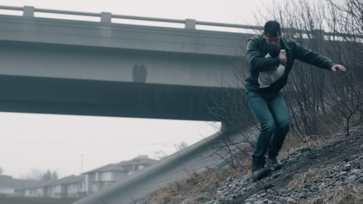 A man in a gray sweatshirt stood by the guardrail. He looked around, then hurled something into the river.