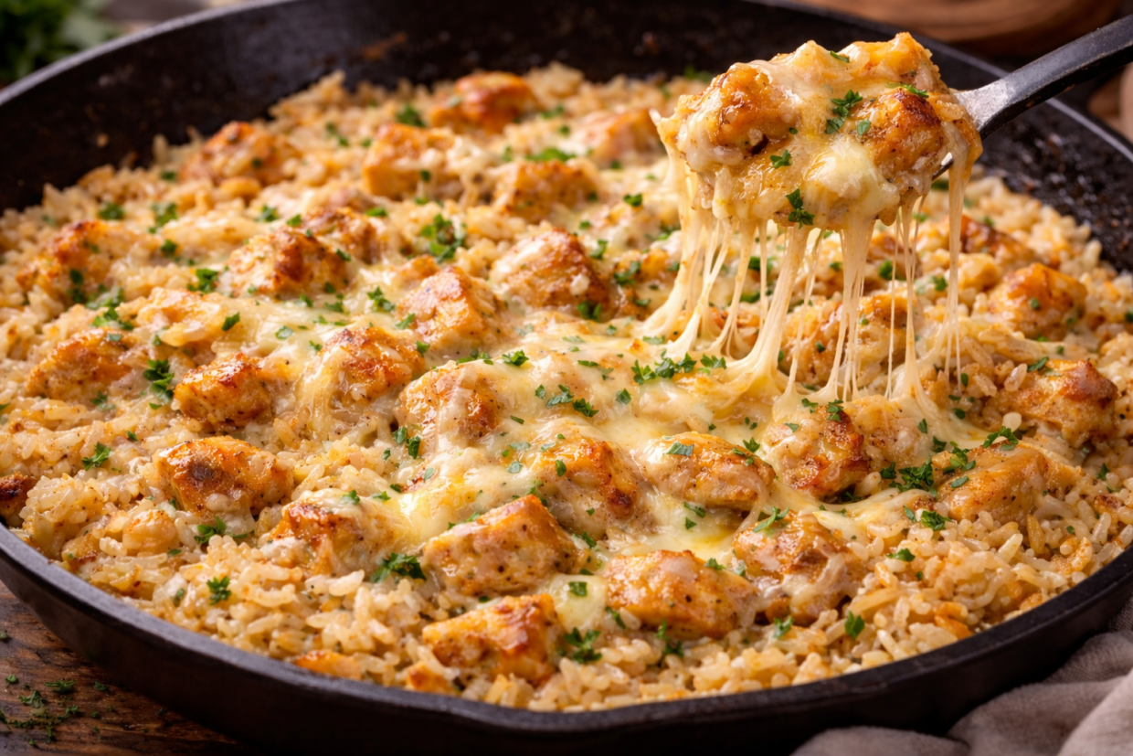 - Add cooked rice and chicken broth. Stir and cook 2–3 minutes until hot.