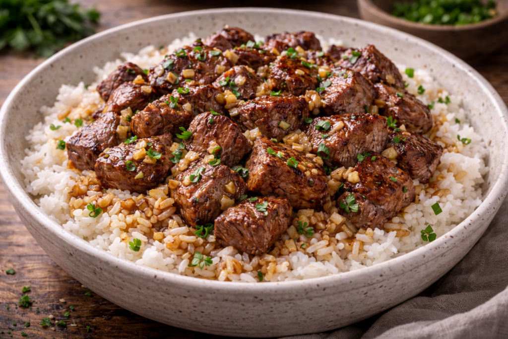 - Serve over hot rice. Spoon garlic butter on top. Finish lightly.