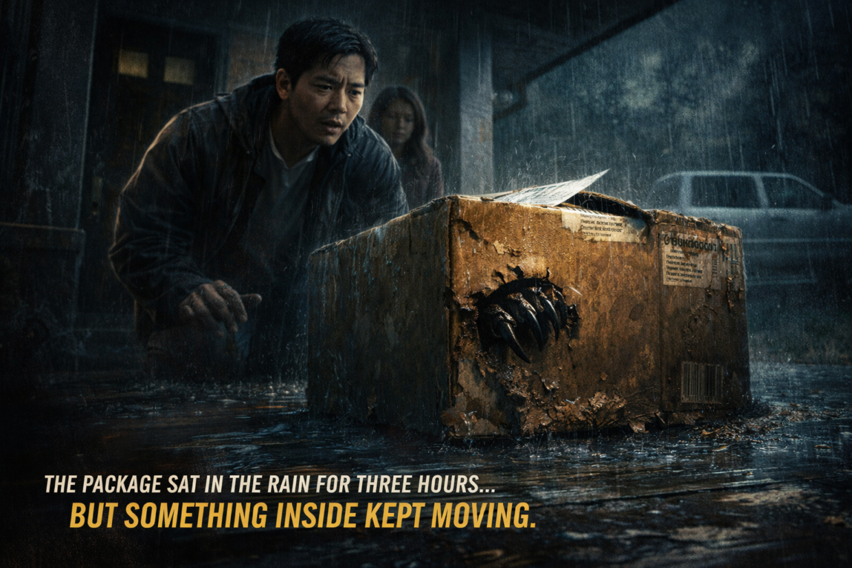 The cardboard package sits on Marcus Chen’s front porch, rain turning the brown exterior into a soggy mess. Water drips steadily from the overhang above.