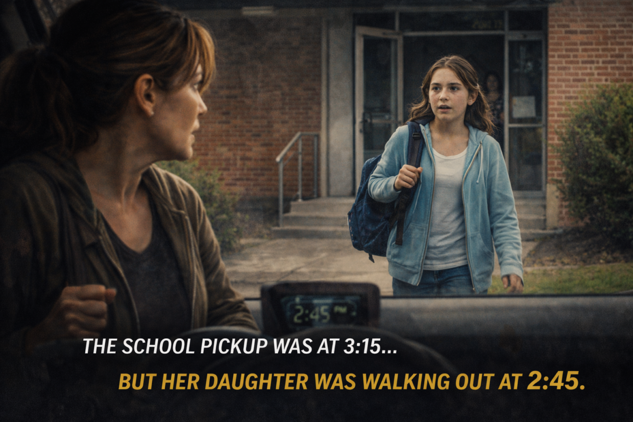 School pickup was at 3:15… but her daughter walked out at 2:45 with a note she never wrote.