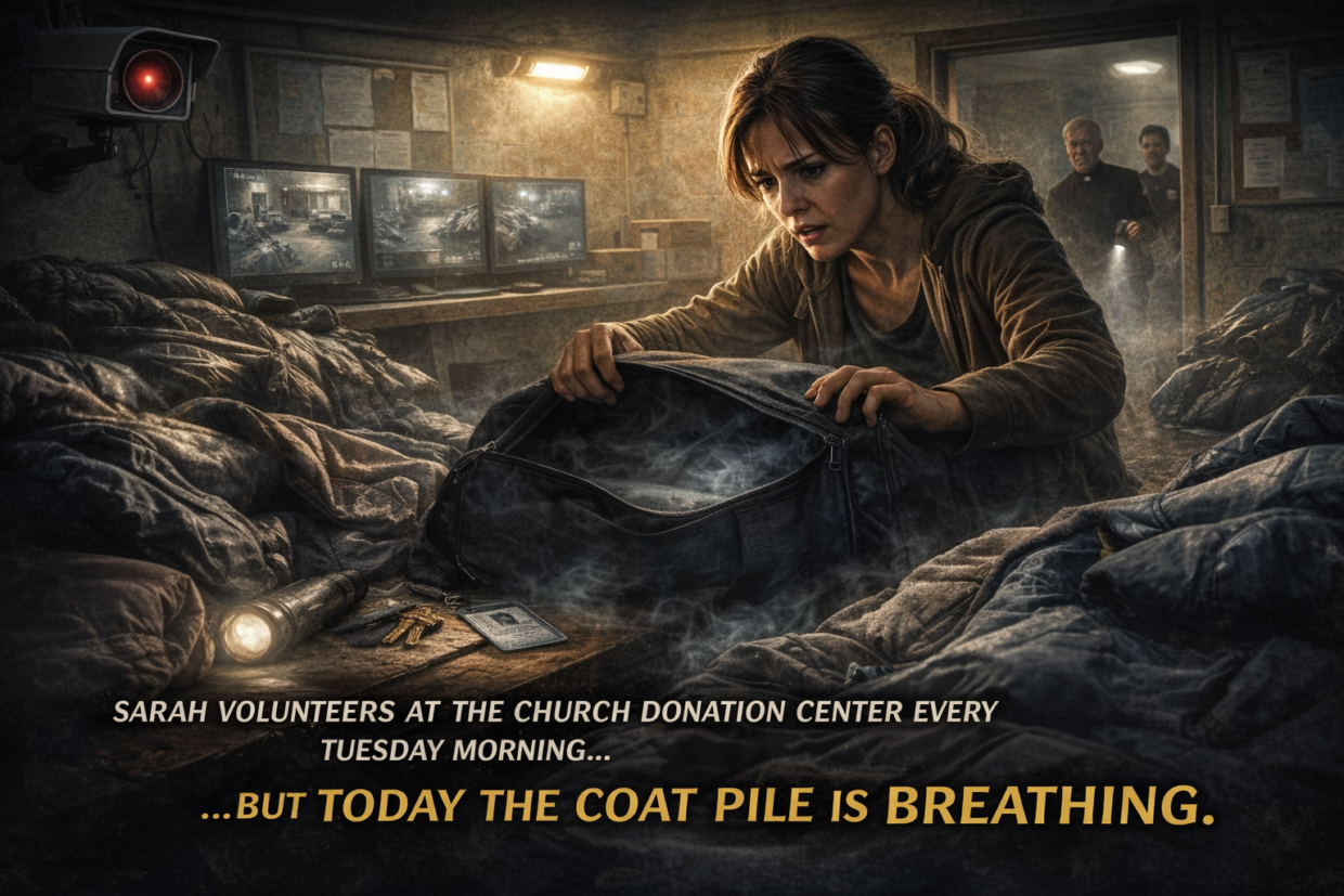 Sarah volunteers at the church donation center every Tuesday morning… But today the coat pile is breathing.
