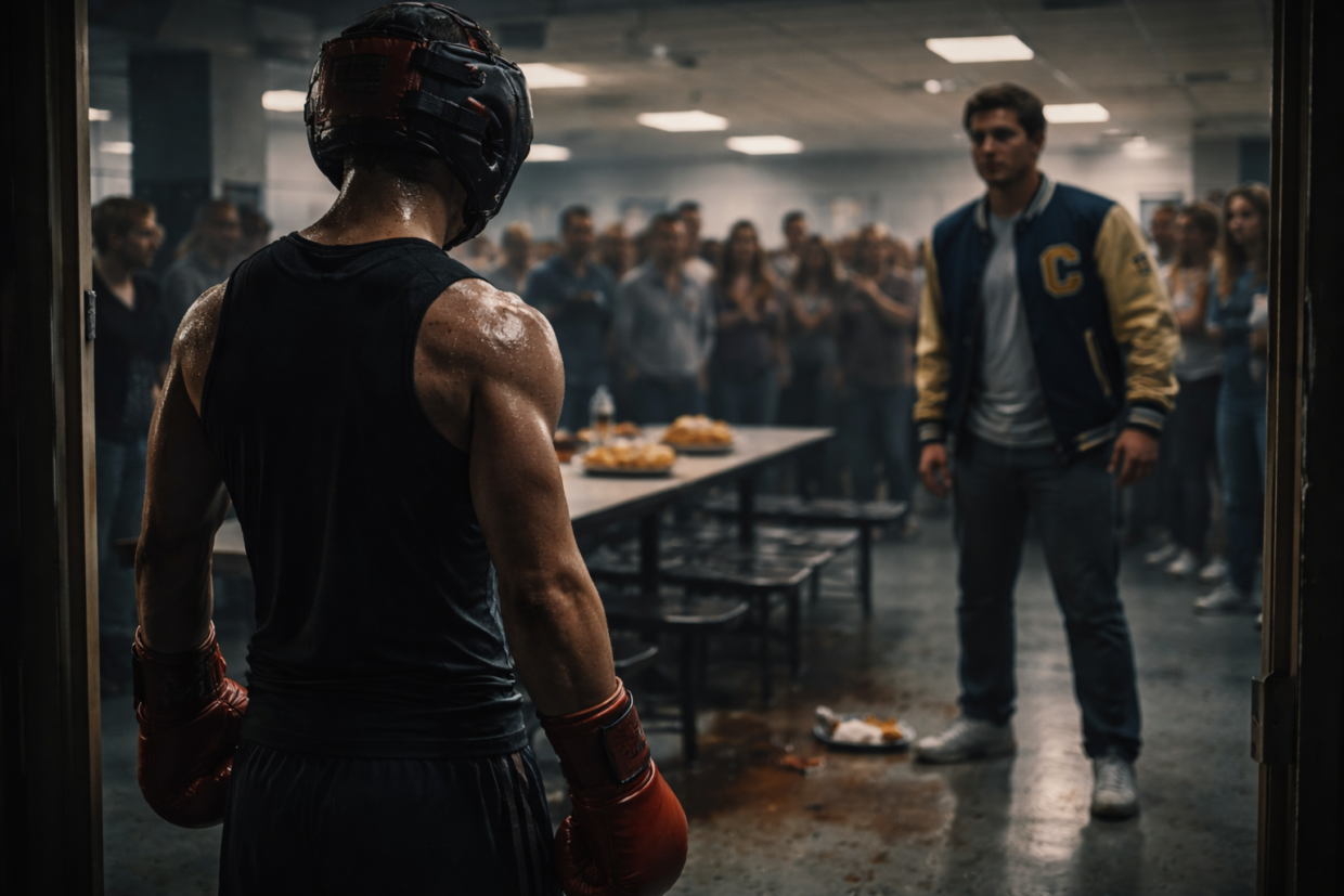 I crossed the cafeteria in twelve seconds. Students scattered. Connor’s football buddies saw me first — saw the sixteen-ounce gloves, the headgear, the compression shirt soaked with sweat.