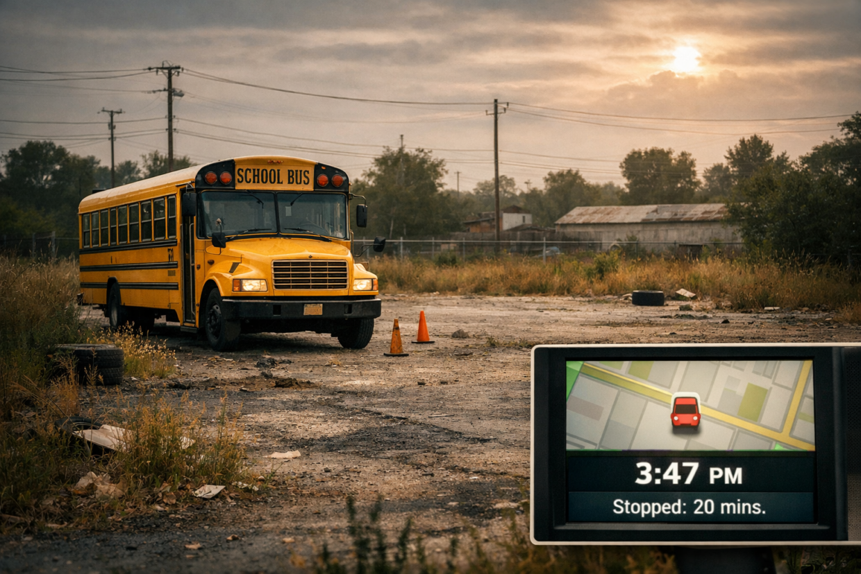 The school bus always arrived at 3:47 PM… But today the GPS showed it stopped for twenty minutes at an empty lot.