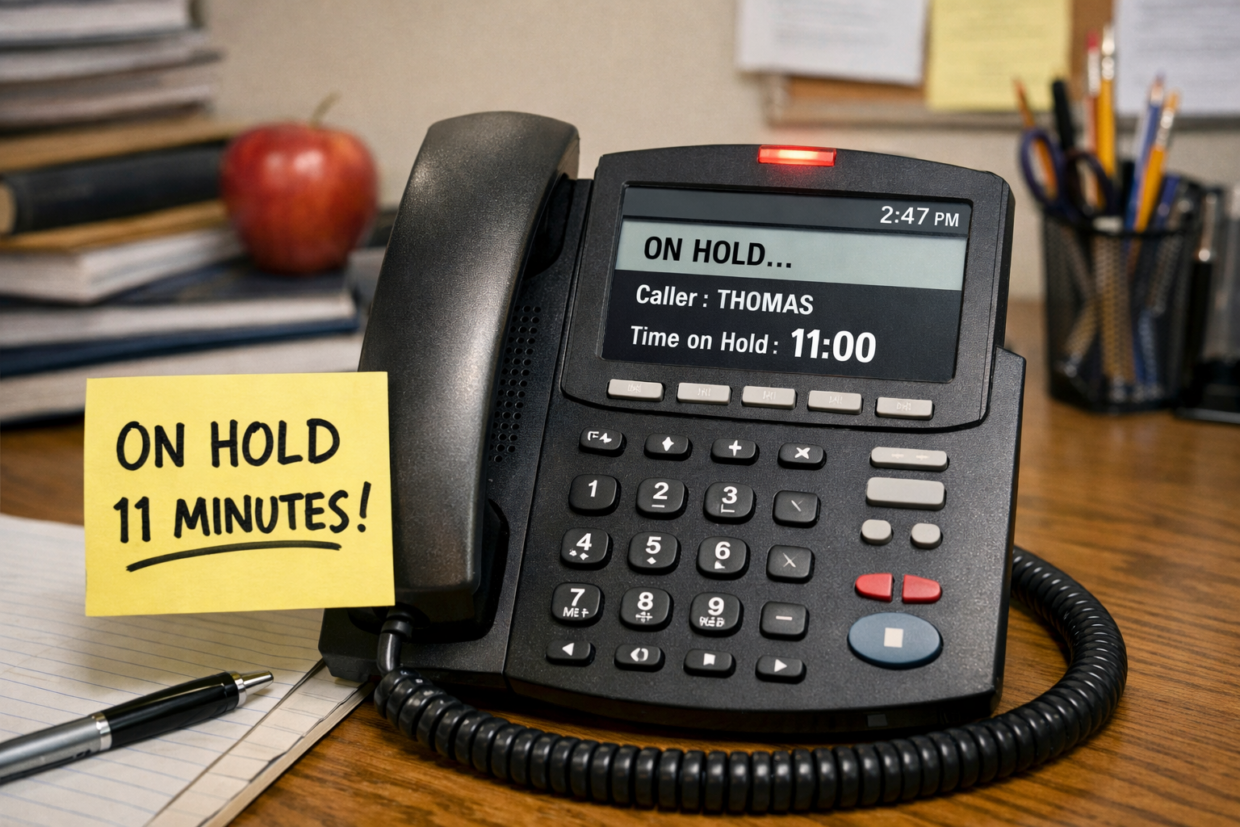 Thomas called the school office at 2:47 PM… But stayed on hold for eleven minutes.