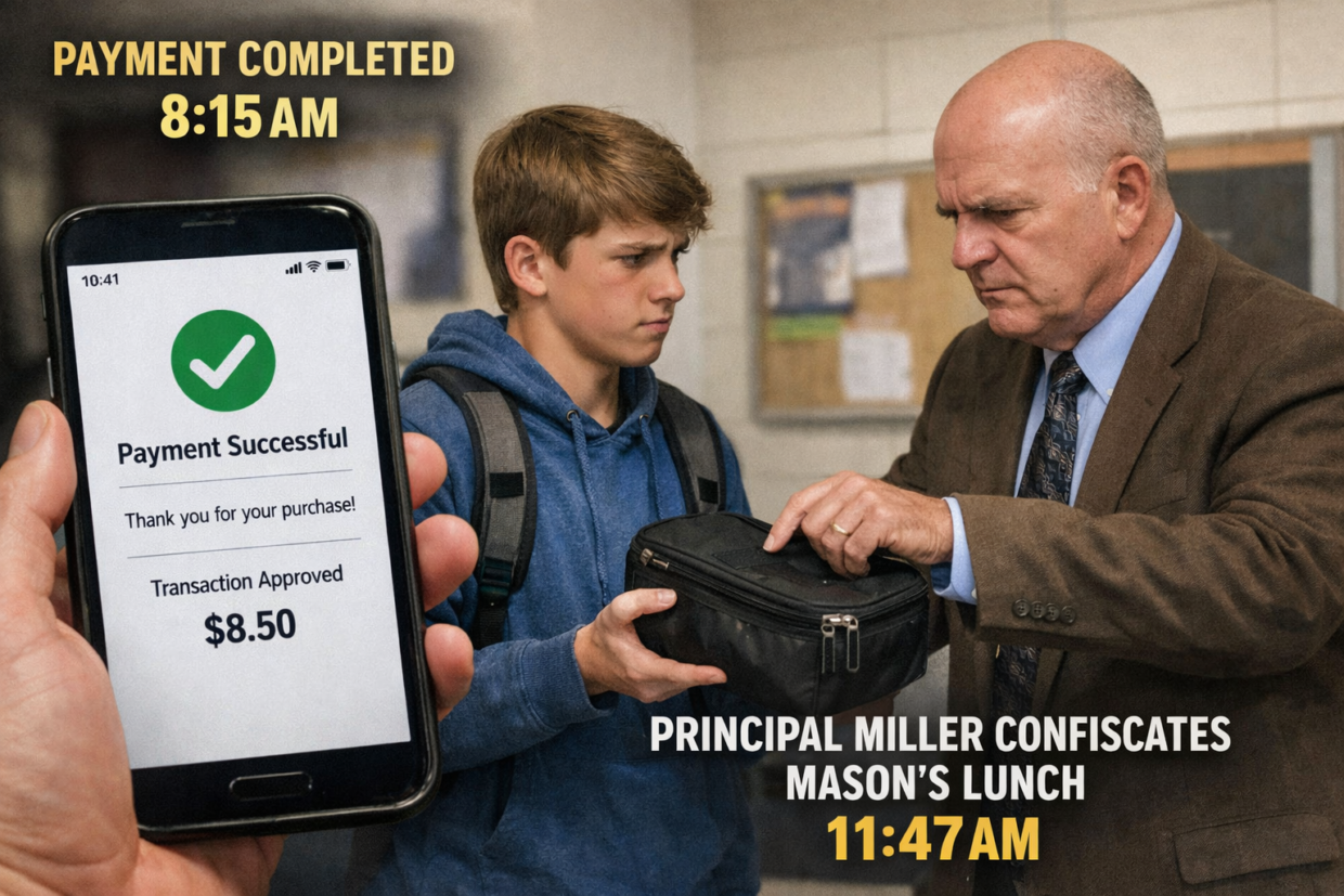 Principal Miller confiscates Mason’s lunch at 11:47 AM… But the payment went through at 8:15 AM that morning.